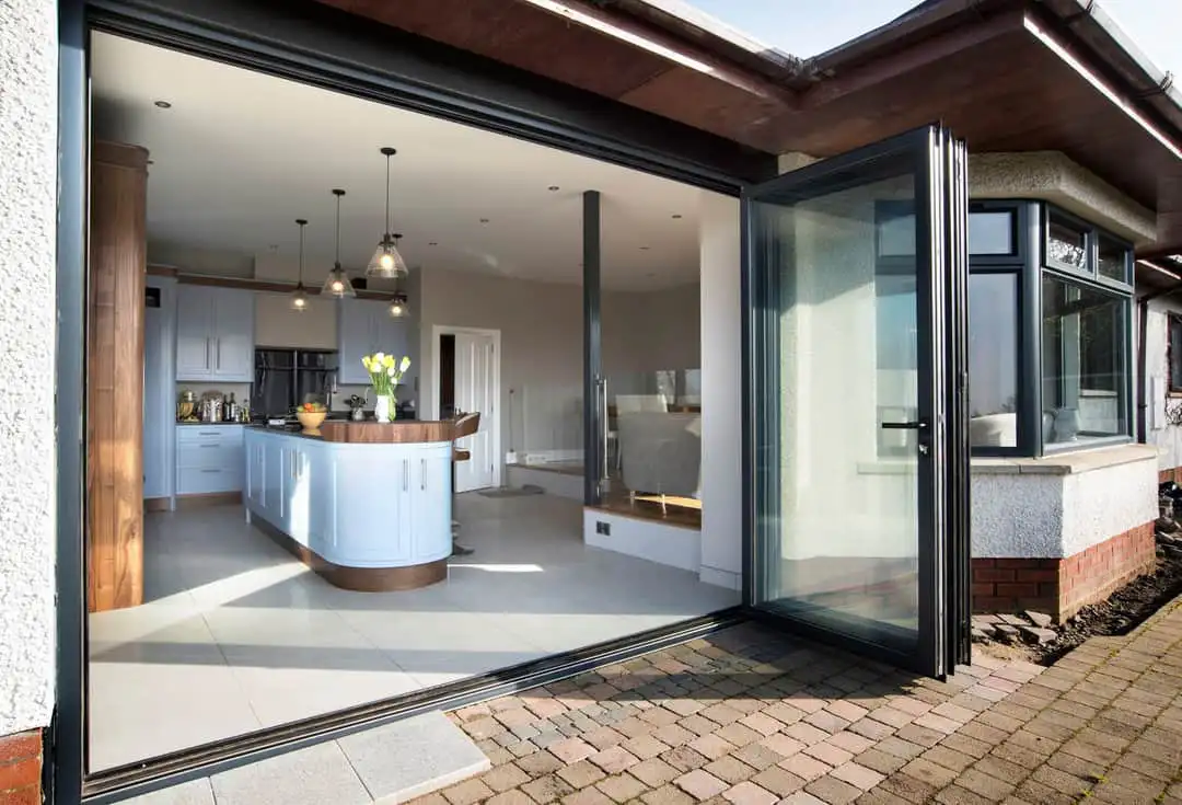 The AP400 our premium lift-and-slide aluminium door system designed for large openings (patios, terraces, garden facades) where large, glazed expanses, smooth operation, thermal performance, and security are required.